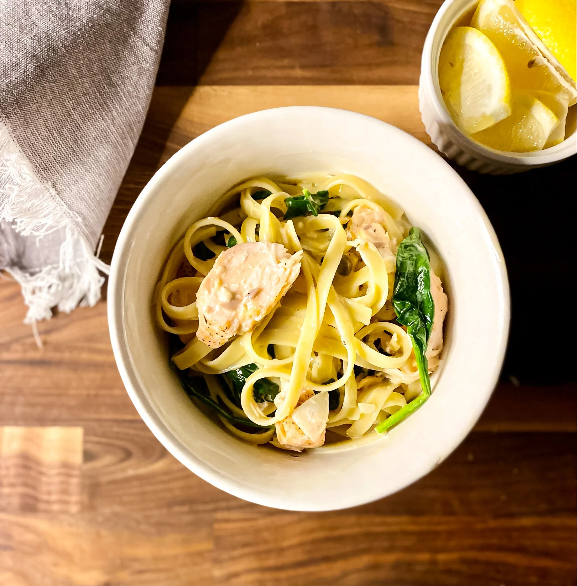Add the cooked pasta, cooked salmon flaked into bite sized pieces, spinach and capers and stir to combine. Allow the mixture to cook until the pasta is cooked through and the spinach is wilted.