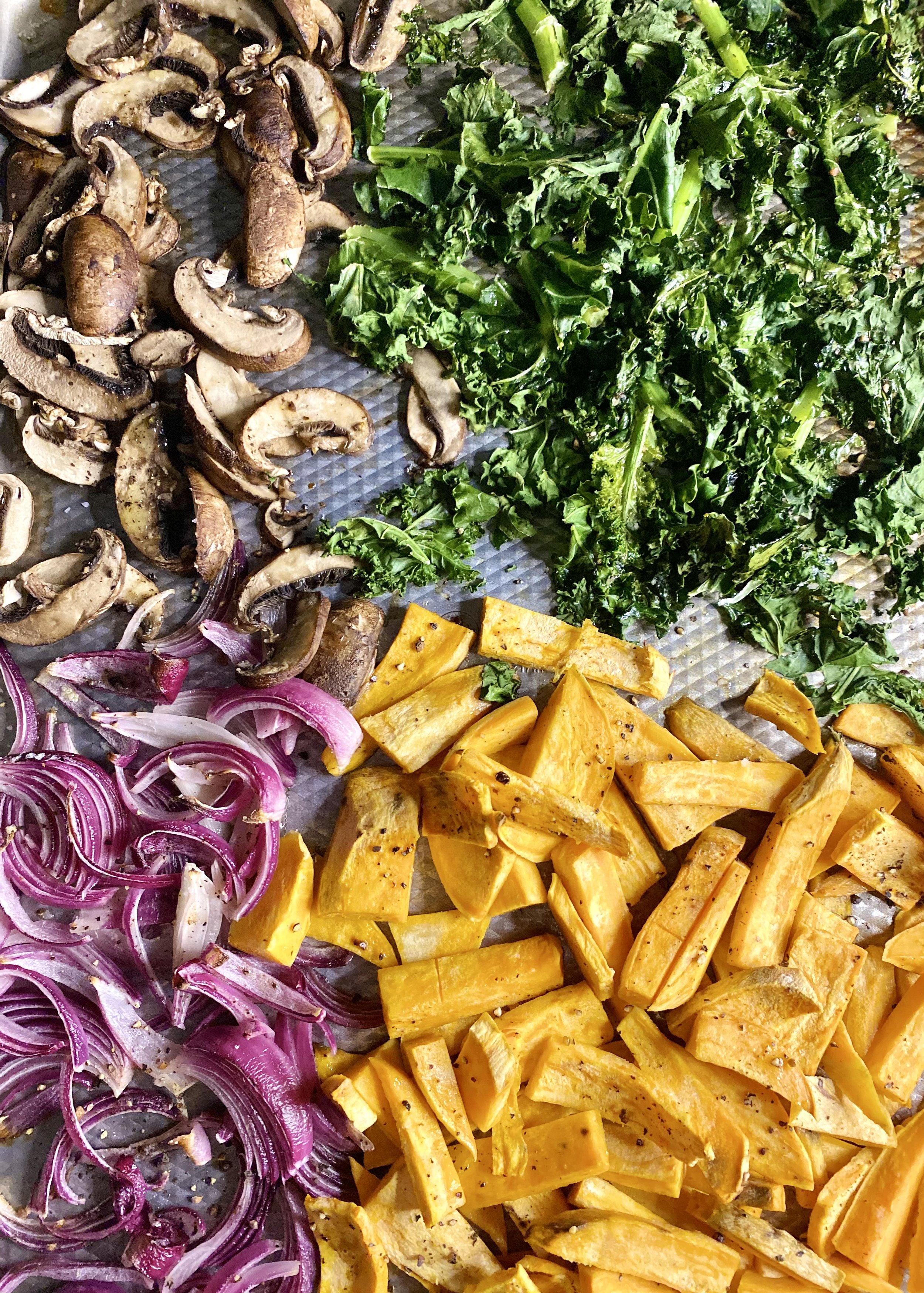 - Chop sweet potatoes, onions, mushrooms and kale into bite size pieces. Put the sweet potatoes, mushrooms and onions on a sheet pan and toss with 2 tbsp. olive oil. Season with salt and pepper to taste. Put the sheet pan in the oven and let the vegetables roast for 15 minutes. (You will add the kale to the pan part way through cooking, to prevent it from charring.)