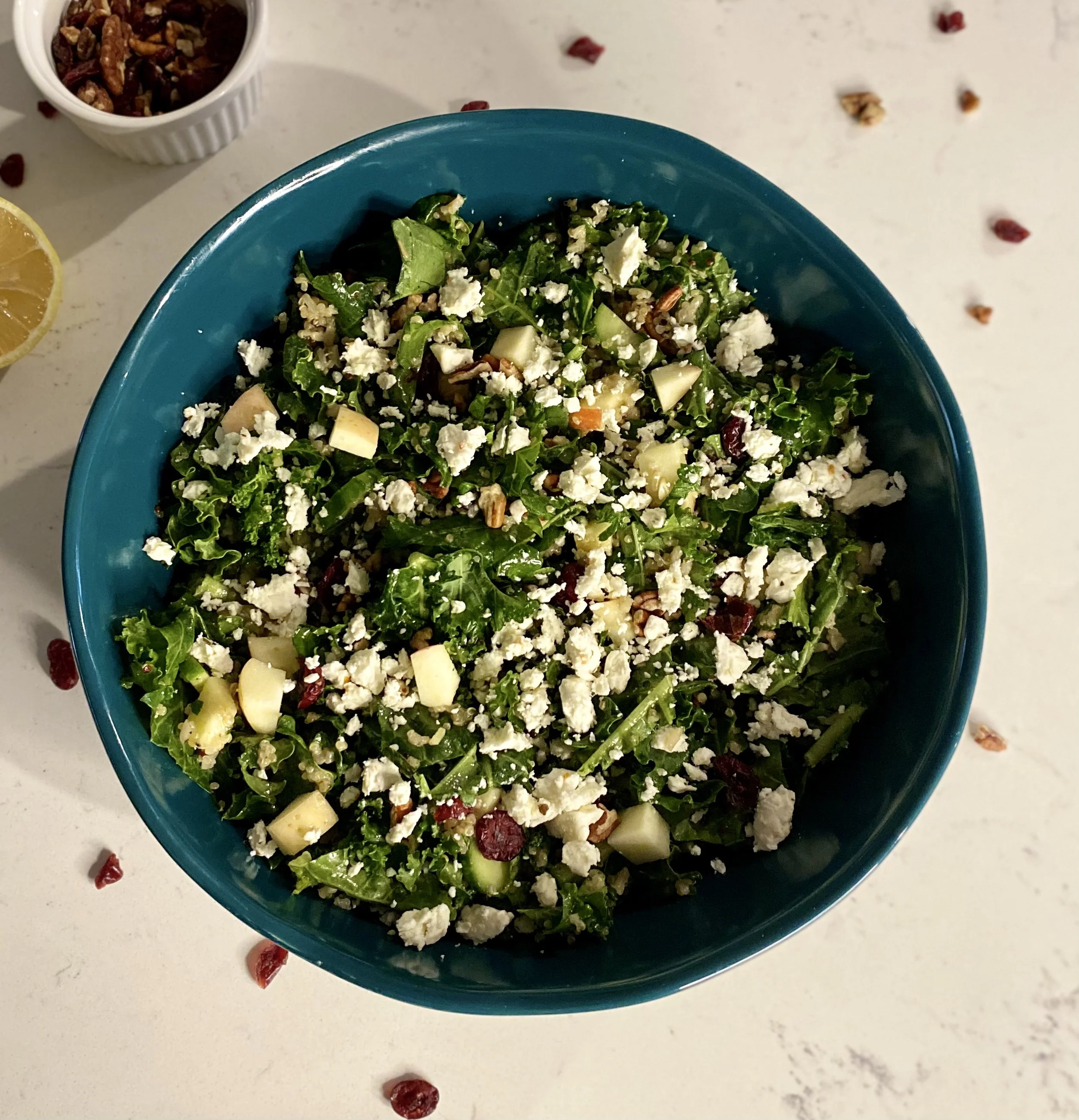 Toss salad together with the dressing and enjoy! This is a great meal prep salad because the kale does not wilt easily so it will hold up for several days.